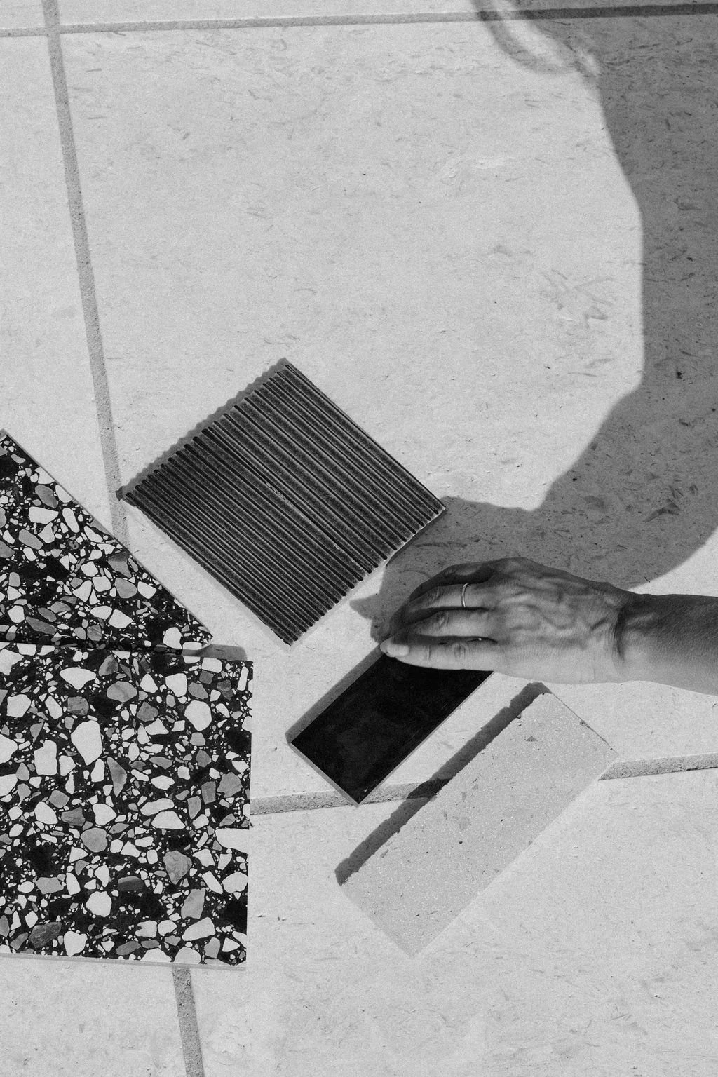 material palettes (stone, gravel, planters, walls)